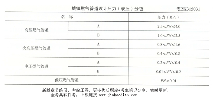 知识点:城镇燃气管道工程施工中燃气管道的分类。表2K315031高压B燃气管道的压力为1.6<P≤2.5。