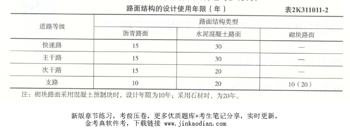 表2k311011-2 快速路、水泥混凝土路面是30年,快速路、沥青路面是15年,支路砌块路面是10年,支路水泥混凝土20年.