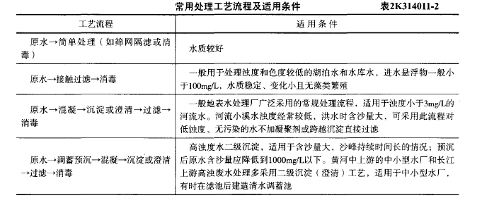 表2K314011-2,原水→混凝、沉淀或澄清→过滤→消毒→出水,一般地表水处理厂广泛采用的常规处理流程,适用于浊度小于3mg/L的河流水。