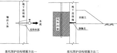 围护结构缺陷造成的渗漏一般采用下面方法处理:在缺陷处插入引流管引流,然后采用双快水泥封堵缺陷处,等封堵水泥形成一定强度后再关闭导流管。如果渗漏较为严重直接封堵困难时,则应首先在坑内回填土封堵水流,然后在坑外打孔灌注聚氨酯或双液浆等封堵渗漏处,封堵后再继续向下开挖基坑,具体见下面两图。
