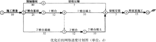 优化后的网络进度计划如下图所示,关键线路是:施工准备→1#桥台基础→1#桥台→2#桥台→2#桥台填土→梁板安装→桥面系施工。或者写:①→②→③→④→⑤→⑦→⑧→⑨→⑩。节点工期是87d,小于90d,满足节点工期要求。