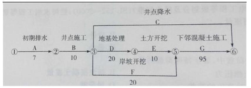 承包人承担某水闸工程施工,编制的施工总进度计划中相关工作如下:①场内道路,②水闸主体施工,③围堰填筑,④井点降水,⑤材料仓库,⑥基坑开挖,⑦地基处理,⑧办公、生活用房等。监理工程师批准了该施工总进度计划。其中部分工程施工网络进度计划如下图所示(单位:天)。