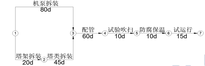 附加说明:管道试压吹扫与管道、设备防护保温两项工作之间有搭接作业的可能;考虑试运行不可预见因素多,试运行15d时间有压缩余地,这三项工作存在缩短工期的潜力。