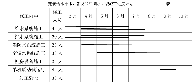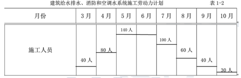 某项目管道工程,内容有:建筑给水排水系统、消防水系统和空调水系统的施工。某分包单位承接该任务后,编制了施工方案、施工进度计划(见表1-1中细实线)、劳动力计划(见表1-2)和材料采购计划等;施工进度计划在审批时被否定,原因是给水、排水系统的施工顺序违反了施工原则,分包单位调整了该顺序(见表1-1中粗实线)。