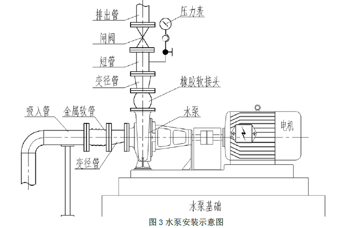 在安装质量检查时,发现水泵的吸入及排出管路上存在管件错用,漏装和安装位置错误等质量问题(见图3),不符合规范要求,监理工程师要求项目部进行整改,随后上级公司对项目质量检查时发现,项目部未编制水泵安装质量预控方案。