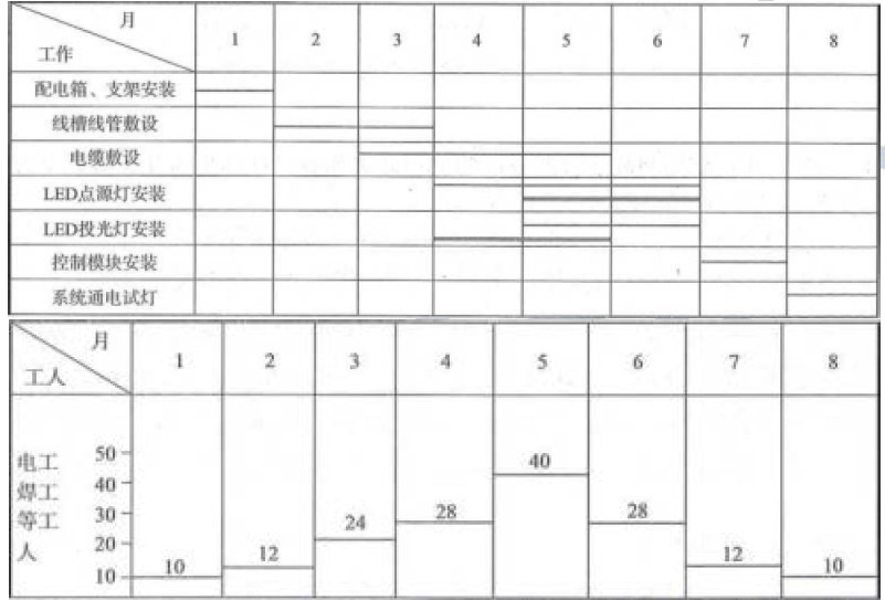 安装公司项目部进场后,依据合同、施工图、规范和幕墙施工进度计划等编制了泛光照明工程施工方案、施工进度计划和劳动力计划如图。方案中点源灯的安装选用吊篮施工,按进度计划租赁4台吊篮。