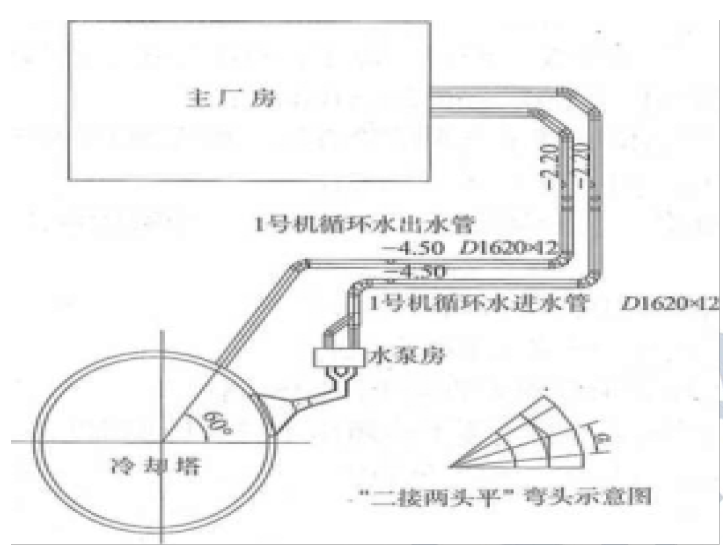 甲公司承接了某电厂循环水管道安装工程,由乙公司实行监理,施工范围为主厂房至冷却塔、水泵房至主厂房二根DN1600钢管安装及土方开挖与回填。管道设计压力为0.25MPa,90°弯头采用“三节两头平”斜接弯头,45°、60°弯头采用“二节两头平”的斜接弯头,管道采用埋地平行敷设,现场原始地面标为±0.00m,管道布置及45°、60°弯头形式如图所示。