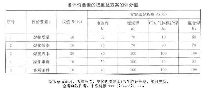 某机电安装公司承建了一植物油厂的锅炉机电安装工程,为保证质量、加快进度、降低成本,该公司项目部组织有关技术人员进行施工方案设计,为了选择确定能保证焊接质量的焊接方法,已初选出电渣焊、埋弧焊、气体保护焊、混合焊四个焊接方案。根据调查资料和本公司实践经验,已定出各评价要素的权重及方案的评分值,见下表。