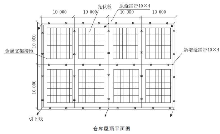 因光伏板安装在仓库屋面,仓库建筑的防雷类别应提高一个等级,建筑屋面需增加避雷带(见图3);光伏板用金属支架固定,并接地可靠,20块光伏板串联成一个光伏直流发电回路,用2芯电缆接到直流汇流箱。项目部依据规范和设计要求编制了光伏发电工程的施工技术方案,并在施工前进行了技术和安全交底。