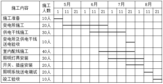 安装公司项目部进场后,编制了建筑电气工程的施工方案、施工进度及劳动力计划(见下表)。