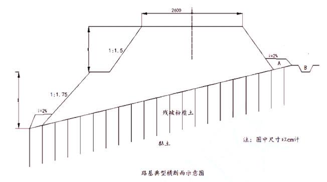 某高速公路K58+340~K58+780段为斜坡软弱地基路段,该区域构造属于侵蚀低丘地貌,冲沟相间,丘陵斜坡较缓,地表以下分布第四系残破粉质土,厚度4m左右,属斜坡软弱层,其下为黏土层,较厚。路基典型横断面示意图如图1所示。