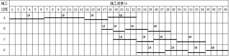 根据现场施工便道情况,施工单位决定分别针对 A、B、C、D 四道工序组织四个专业作业队伍,按 1 号→2 号→3 号→4 号涵洞的顺序采用流水作业法施工,确保每个专业作业队的连续作业。在每个涵洞的“基础开挖及软基换填”工序之后,按《隐蔽工程验收制度》规定,必须对基坑进行检查和验收,检查和验收时间(间歇时间)按 2 天计算。