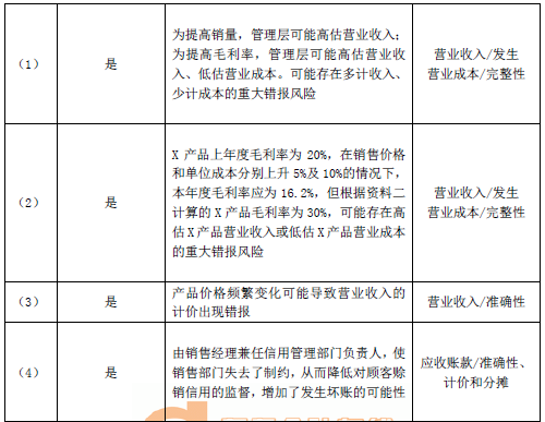 针对资料一第(1)至(4)项,结合资料二,假定不考虑其他条件,逐项指出资料一所列事项是否可能表明存在重大错报风险。如果认为可能表明存在重大错报风险,简要说明理由。如果认为该风险为认定层次重大错报风险,说明该风险主要与哪些财务报表项目(仅限于:营业收入、营业成本、应收账款)的哪些认定相关(不考虑税务影响)。