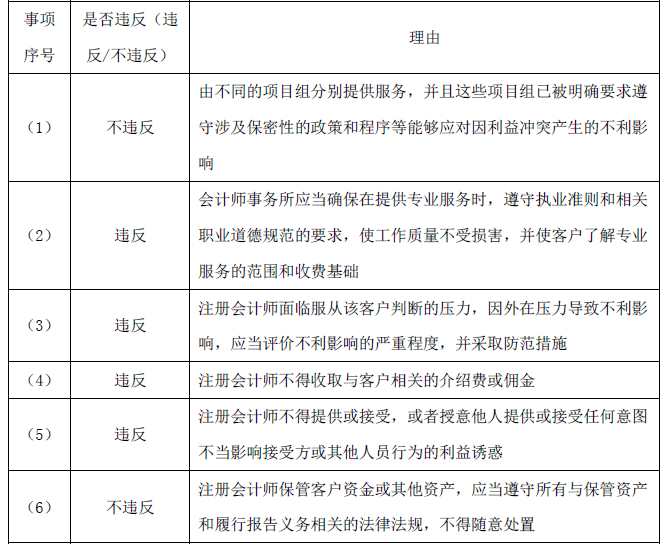 针对上述第(1)至(6)项,逐项指出是否存在违反中国注册会计师职业道德守则有关职业道德规定的情况,并简要说明理由。