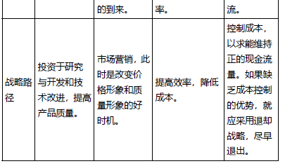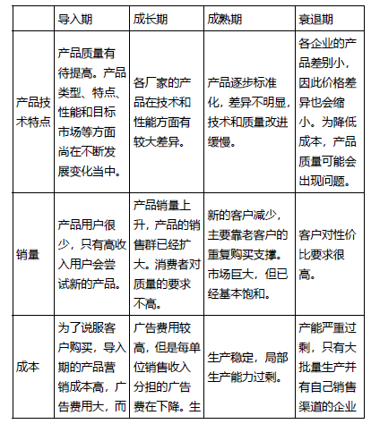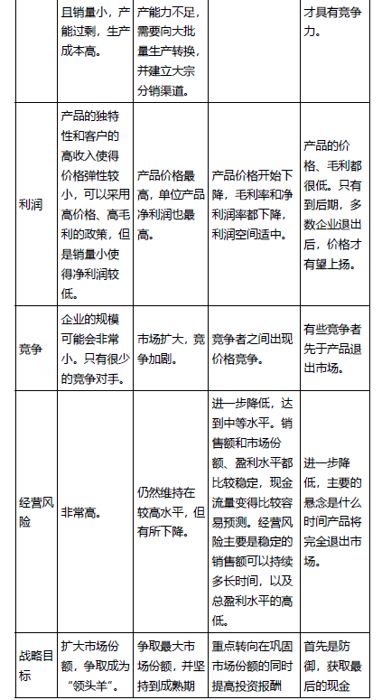 产品生命周期各阶段特征如下: (复习主线:产品技术特点→销量→成本→利润→竞争→经营风险→目标→路径)