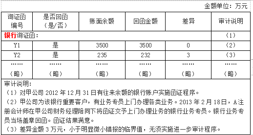 (2013年)A注册会计师确定甲公司2012年度财务报表整体的重要性为200万元,明显微小错报的临界值为10万元。A注册会计师实施了银行函证程序,相关审计工作底稿的部分内容摘录如下: