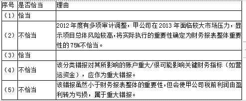 (2)由于2012年度审计中提出的多项审计调整建议金额均不重大,A注册会计师确定2013年度实际执行的重要性为财务报表整体重要性的75%,与2012年度保持一致。