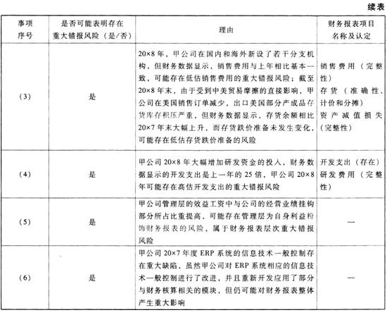 (1)针对资料一第(1)至(6)项,结合资料二,假定不考虑其他条件,逐项指出资料一所列事项是否可能表明存在重大错报风险,如果认为可能表明存在重大错报风险,简要说明理由。