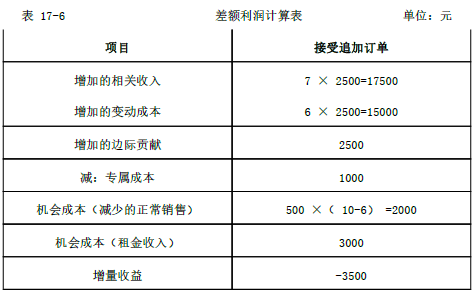 增加的相关成本 =变动成本 +丧失正常订单的机会成本 =6× 2500+500×( 10-6) =17000