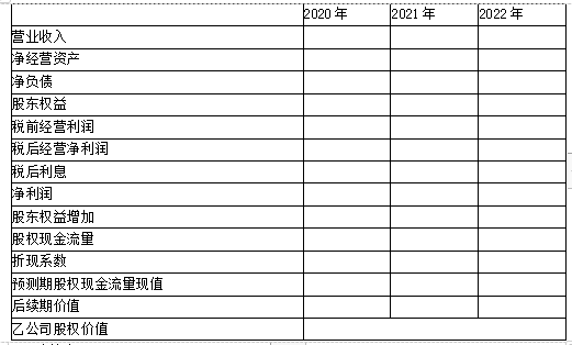 (2)如果增资,采用股权现金流量折现摸型,估计2020年初乙公司股权价值(计算过程和结果填入下方表格中)。