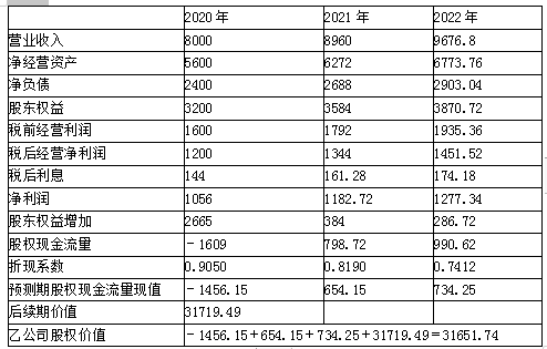 (2)增资后,甲公司拟通过改进乙公司管理和经营战略,增加乙公司收入和利润。预计乙公司2020年营业收入8000万元,2021年营业收入比2020年增长12%,2022年进入稳定增长状态,增长率8%。