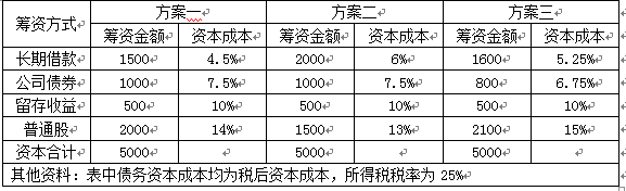 甲公司需要进行一项投资,需要资金5000万元,有以下三种筹资方案,如下表所示: