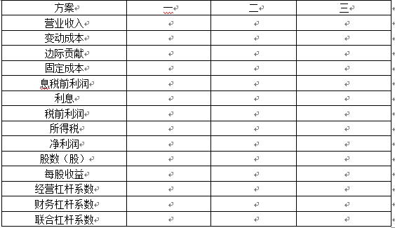 (1)计算三个方案下的每股收益、经营杠杆系数、财务杠杆系数和联合杠杆系数(请将联合杠杆系数结果填入下列表格中,不必列示计算过程);