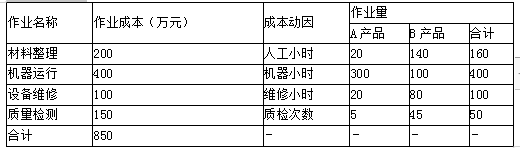 甲公司为一家制造类企业,主要生产A、B两种产品。A、B两种产品的产量分别为500台和250台,单位直接成本分别为0.4万元和0.6万元。此外A、B两种产品制造费用的作业成本资料如表:
