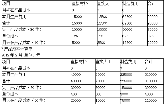 由于直接材料在生产开始时一次投入,所以,B产品直接材料单位成本=40000/(50+50)=400(元/件);