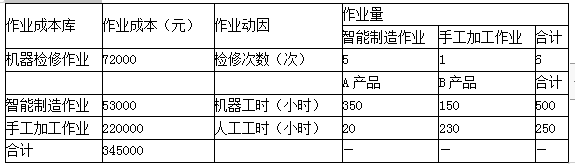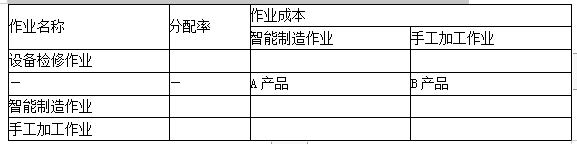 目前,A产品供不应求,B产品滞销。公司销售经理建议A提价,B降价,以提高公司获利能力。生产经理认为制造费用大部分由智能制造设备引起,按直接人工工资比例分配导致A、B产品成本计算不准确,应采用作业成本法对制造费用分配进行优化,从而为调价提供可靠的成本数据。公司财务部门和生产技术部门对生产过程进行了分析,识别出三项作业,分别是设备检修作业、智能制造作业和手工加工作业。设备检修作业负责对智能制造设备、手工加工设备进行检修,作业动因是检修次数;智能制造作业的作业动因是机器工时;手工加工作业的作业动因是人工工时。直接人工成本不再单列成本项目,被归入相应作业库。相关资料如下: