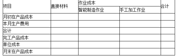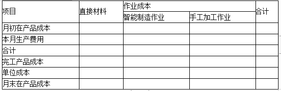 甲公司是一家制造业企业,生产A、B两种产品。生产车间有两台设备,其中,一台属于高端智能制造设备,另一台属于手工加工设备。A、B产品均需先后经过智能制造和手工加工两道作业工序方可完成。A产品主要由智能制造设备完成,B产品主要由手工加工设备完成。直接材料均在开工时一次性投入。公司现采用传统成本计算法计算成本,直接材料、直接人工直接计入产品成本,制造费用先按车间归集,再按直接人工工资比例分配进入产品成本。2019年9月生产成本相关资料如下: