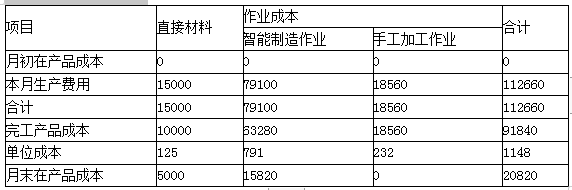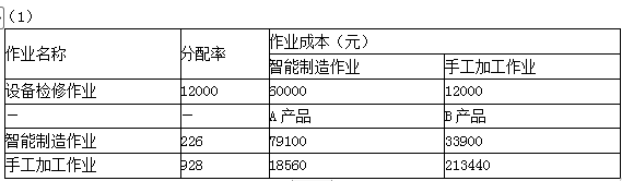 智能制造作业的分配率=(53000+60000)/500=226(元/件),其中的60000是分配的设备检修作业成本。手工加工作业的分配率计算也是同样的思路。(220000+12000)/250=928(元/件)。