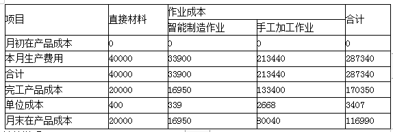 由于B产品的月末在产品智能制造作业全部完成,因此,分配智能制造作业成本时,月末在产品的完工程度按照100%计算,即B产品智能制造作业单位成本=33900/(50+50×100%)=339(元/件);