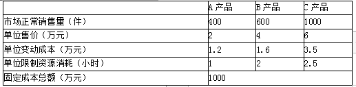 资料一:A、B、C三种产品都需要通过一台关键设备加工,该设备是公司的关键限制资源。年加工能力2500小时。假设A、B、C三种产品当年生产当年销售。年初年末无存货,预计2019年A、B、C三种产品的市场正常销量及相关资料如下: