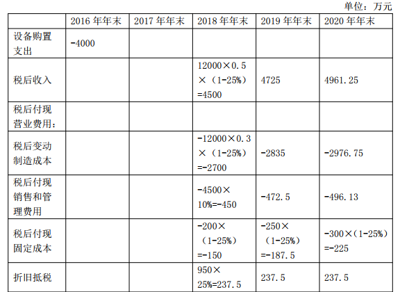 (3)该项目预计2018年生产并销售12000万罐,产销量以后每年按5%增长,预计易拉罐单位售价0.5元,单位变动制造成本0.3元,每年付现销售和管理费用占营业收入的10%,2018年、2019年、2020年每年付现固定成本分别为200万元、250万元、300万元。