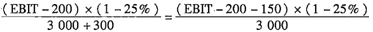 每股收益 =(EBIT-200)×(1-25%)÷(3000+300)