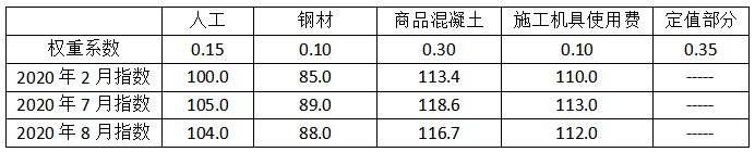 (2020年真题)某市政工程施工合同中约定:(1)基准日为2020年2月20日;(2)竣工日期为2020年7月30日;(3)工程价款结算时人工单价、钢材、商品混凝土及施工机具使用费采用价格指数法调差,各项权重系数及价格指数见下表,工程开工后,由于发包人原因导致原计划7月施工的工程延误至8月实施,2020年8月承包人当月完成清单子目价款3000万元,当月按已标价工程量清单价格确认的变更金额为100万元,则本工程2020年8月的价格调整金额为( )万元。