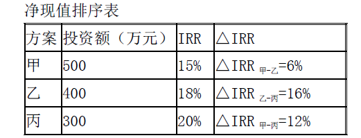 某项目有甲、乙、丙三个投资方案,各方案的投资额及内部收益率见下表。若已知基准折现率为10%,则各方案净现值由大到小排序为( )。