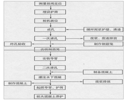 - A.测量放线定位→桩机就位→埋设护筒→成孔→一次清孔→安装导管→安装钢筋笼→二次清孔→灌注水下混凝土→起拔导管、护筒→桩头混凝土养护