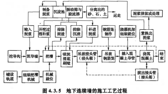 地下连续墙施工工艺流程为:挖导沟→筑导墙→挖槽→吸泥、清底、刷壁→吊放接头管(接头箱)→吊放钢筋笼→插入混凝土导管→浇筑混凝土→结束。