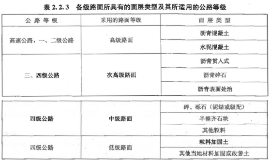 各级路面所具有的面层类型及其所适用的公路等级如下表所示。