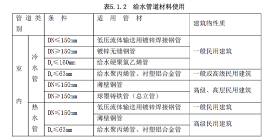 给水管道的材料应根据水质要求和建筑物的性质选用,其使用条件见表5.1.2。