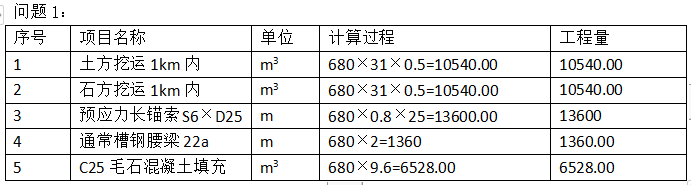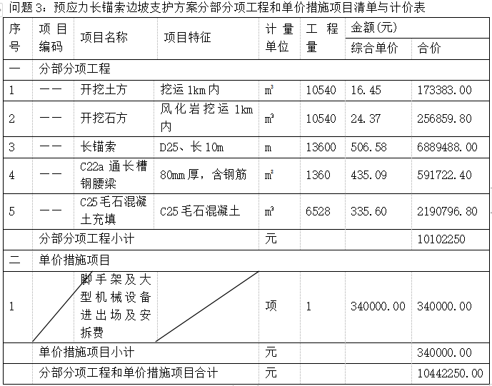3.已知22a通长槽钢腰梁综合单价为435.09元/m、C25毛石混凝土充填综合单价为335.60元/m3,脚手架和大型机械设备进出场及安拆费等单价措施项目费用测算结果为340000.00元。根据问题1和问题2的计算结果,以及表5.1中相应的综合单价、答题卡表中相关的信息,按《房屋建筑与装饰工程工程量计算规范》(GB 50854-2013)的计算规则,在答题卡表5.3中,编制该预应力长锚索支护方案分部分项工程和单价措施项目清单与计价表。