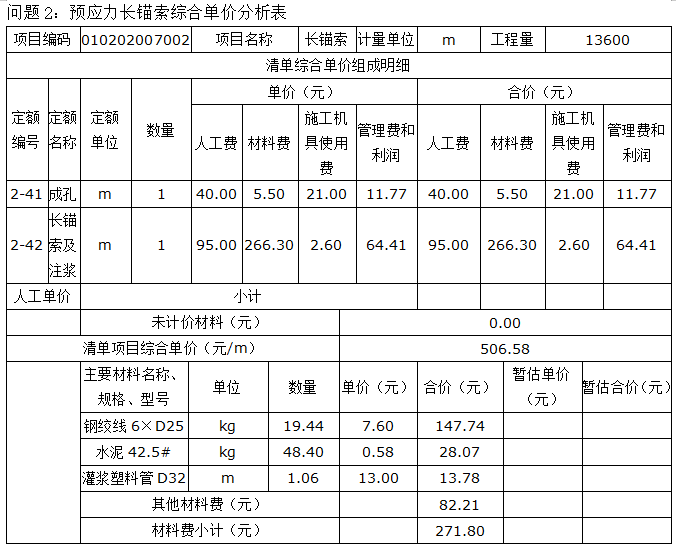 2.若企业管理费按人工、材料、机械费之和的10%计取,利润按人工、材料、机械、企业管理费之和的7%计取。根据表5.2中的数据,按《建设工程工程量清单计价规范》(GB 50500-2013)的计算规则,在答题卡表5.2中,编制该预应力长锚索综合单价分析表(预应力长锚索工程量计量方法,基础定额与清单规范相同,均按设计图示尺寸,以长度(m)为单位)。