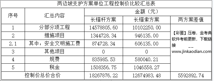 4.若仅有的总价措施安全文明施工费控分部分项工程费的6%计取,其他项目费用为零,其中人工费占分部分项工程费及措施项目费的25%,规费按人工费的21%计取,税金按9%计取,利用表5.1和问题3相应的计算结果,按《建设工程工程量清单计价规范》(GB 50500-2013)的计算规则,在答题卡中列式计算两边坡支护方案的安全文明施工费、人工费、规费,在答题卡表5.4中,编制两边坡支护方案单位工程控制价比较汇总表(两方案差值为长锚杆方案与长锚索方案控制价的差值)。