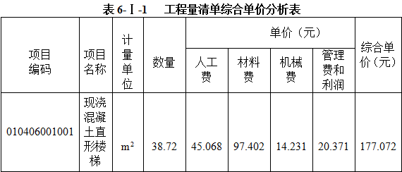 (2)施工企业按企业定额和市场价格计算出每立方米楼梯现浇混凝土的人工费、材料费、机械使用费分别为165元、356.6元、52.1元,并以人工费、材料费、机械使用费之和为基数计取管理费(费率取9%)和利润(利润率取4%)。在表6-I-1“工程量清单综合单价分析表”中,作现浇混凝土直形楼梯的工程量清单综合单价分析(现浇混凝土直形楼梯的项目编码为010406001)。