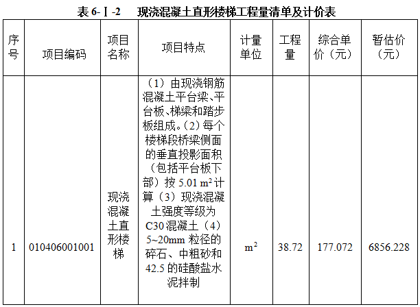 3.按照《建设工程工程量清单计价规范》(GB 50500—2008)的规定,在答题纸表6-I-2“分部分项工程量清单与计价表”中,编制现浇混凝土直形楼梯工程量清单及计价表。