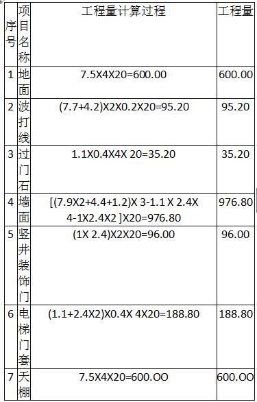 1.根据工程竣工图纸及技术参数,按《房屋建筑与装饰工程工程量计算规范》(GB 50854-2013)的计算规则,在下表6.Ⅰ.1“工程量计算表”中,列式计算该20套电梯厅楼地面、墙面(装饰高度3000mm)、天棚、门和门套等土建装饰分部分项工程的结算工程量(竖井装饰门内的其他项目不考虑)。