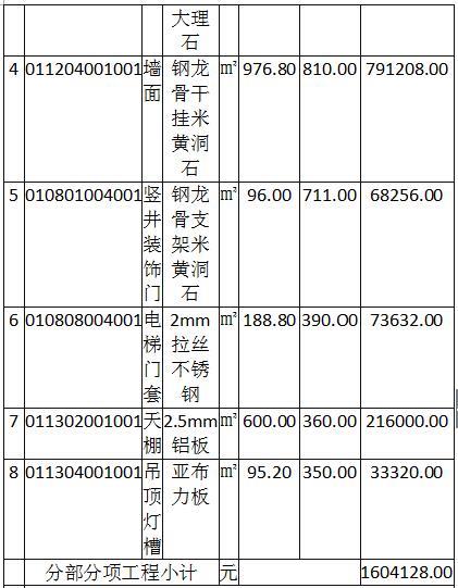 某写字楼标准层电梯厅共20套,施工企业中标的“分部分项工程和单价措施项目清单与计价表”如下表,现根据图6.1.1“标准层电梯厅楼地面铺装尺寸图”、图6.1.2“标准层电梯厅吊项布置尺寸图”所示的电梯厅土建装饰竣X-图及相关技术参数,按下列问题要求,编制电梯厅的竣工结算。