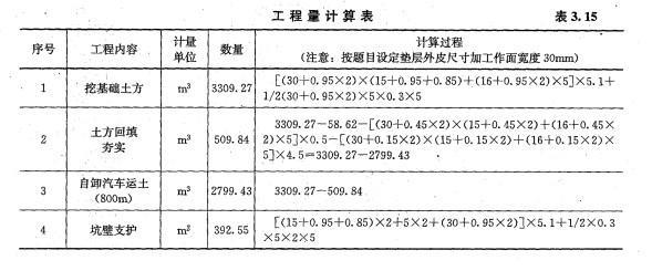 1.预算定额计算规则为:挖基础土方工程量按基础垫层外皮尺寸加工作面宽度的水平投影面积乘以挖土深度,另加放坡工程量,以立方米计箅;坑壁支护按支护外侧直接投影面积以平方米计算,挖、运、填土方计箅均按天然密实土计算。计算挖掘机挖土、土方回填穷实、自卸汽车运土(800m),坑壁支护的工程量,把计算过程及结果填入答题纸表3.15 “工程量计算表”中。